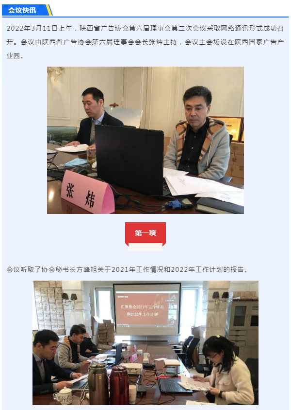 11月上旬,协会常务理事会在广告产业园召开。会议审议通过了新申请入会会员、聘任协会副秘书长、协会分支机构管理办法(修订稿)、分支机构设立等事宜,就发挥常务理事单位优势资源和协会职能作用,为会员、陕西广告产业和陕西品牌赋能进行了座谈研讨。