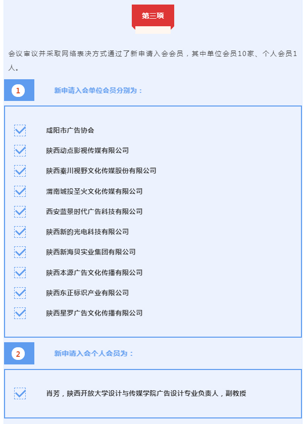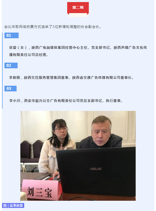 在设立完善秘书处工作部门、调整修订秘书处工作制度的基础上,聘任西安绿一传媒副总经理彭亚惠、知道广告圈创始人毛泽陇、西安标签文化传媒总经理赵韬3位行业青年精英担任协会副秘书长,并明确了工作职责与分工,共同做好协会工作、为会员服务,努力将协会打造成陕西广告人之家。
