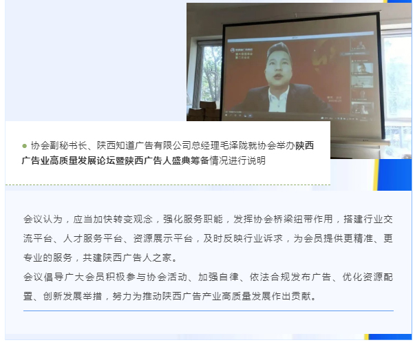 为更好地满足会员对行业资讯的获取、发布需求,协会进一步完善和加强官网、微信公众号、微信群、视频号、抖音号的管理和运营,及时发布时政要闻、行业资讯、协会动态、会员风采。在副秘书长、西安标签文化总经理赵韬的支持下,完成了协会官网的升级改版,使协会网站服务性、功能性、互动性更加强大。协会微信公众号全年发布资讯95篇,其中党政机关及行业监管资讯20篇、行业动态资讯32篇、会员风采展示25篇、协会工作资讯18篇,并不断完善菜单链接功能,关注人数持续上升。协会还注册认证了协会视频号、抖音号,进一步做好会员风采展示、行业活动直播,服务陕西广告业和会员发展。