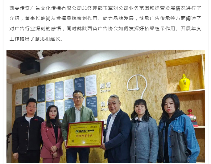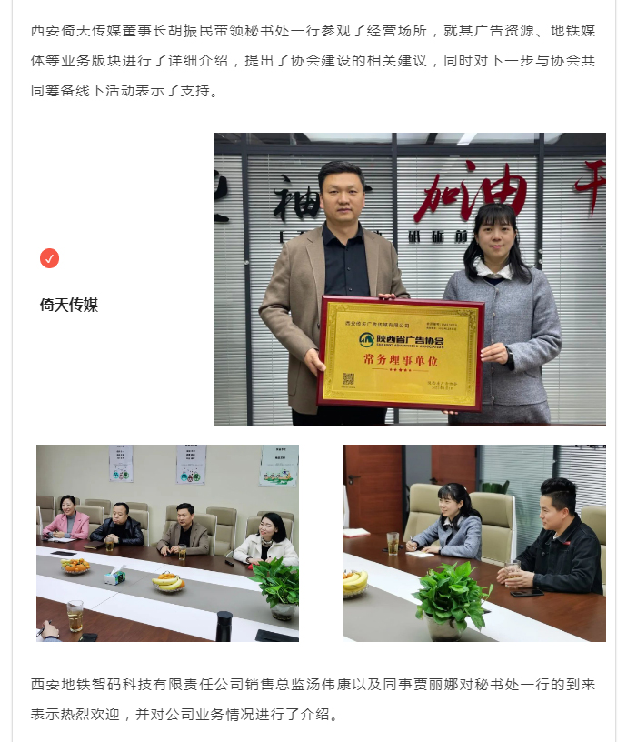 2022年3月29日,威尼斯集团vip5519会长助理张哲、副秘书长彭亚惠、毛泽陇、会员发展部主任罗丽娟走访了常务理事单位西安传奇广告文化传播有限公司、西安倚天广告传媒有限公司和会员单位西安地铁智码科技有限责任公司。