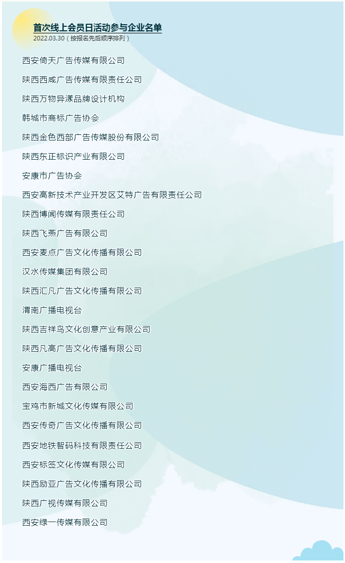 会上,西安倚天广告传媒有限公司总监董磊、宝鸡亲邻科技总经理谢晓伟、陕西东正标识产业有限公司总经理肖潇、陕西飞燕广告有限公司总经理徐飞等与会人员介绍了各自企业的主营板块、产品优势、自有资源及企业相关情况等。