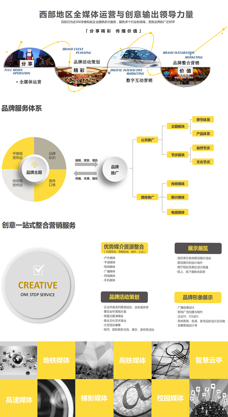 公司业务整体布局:媒体运营、数字营销、品牌营销、会展营销四大板块,以“分享精彩,传播价值”为企业理念,立足于城市综合户外媒体投资与运营,搭建中西部 “多元化、全覆盖”户外媒体整合供应核心平台并着眼于全球,积极提供以品牌和产品的创意、策划、设计、活动营销、公关一体化、一站式整合营销服务。为客户提供专业服务,从媒体传播和现场活动的直接效果开始,到影响目标受众的认知、观点和态度,到最终促进企业品牌形象的提升和销售的增加,帮助客户一步一步地取得竞争优势和商业成功。