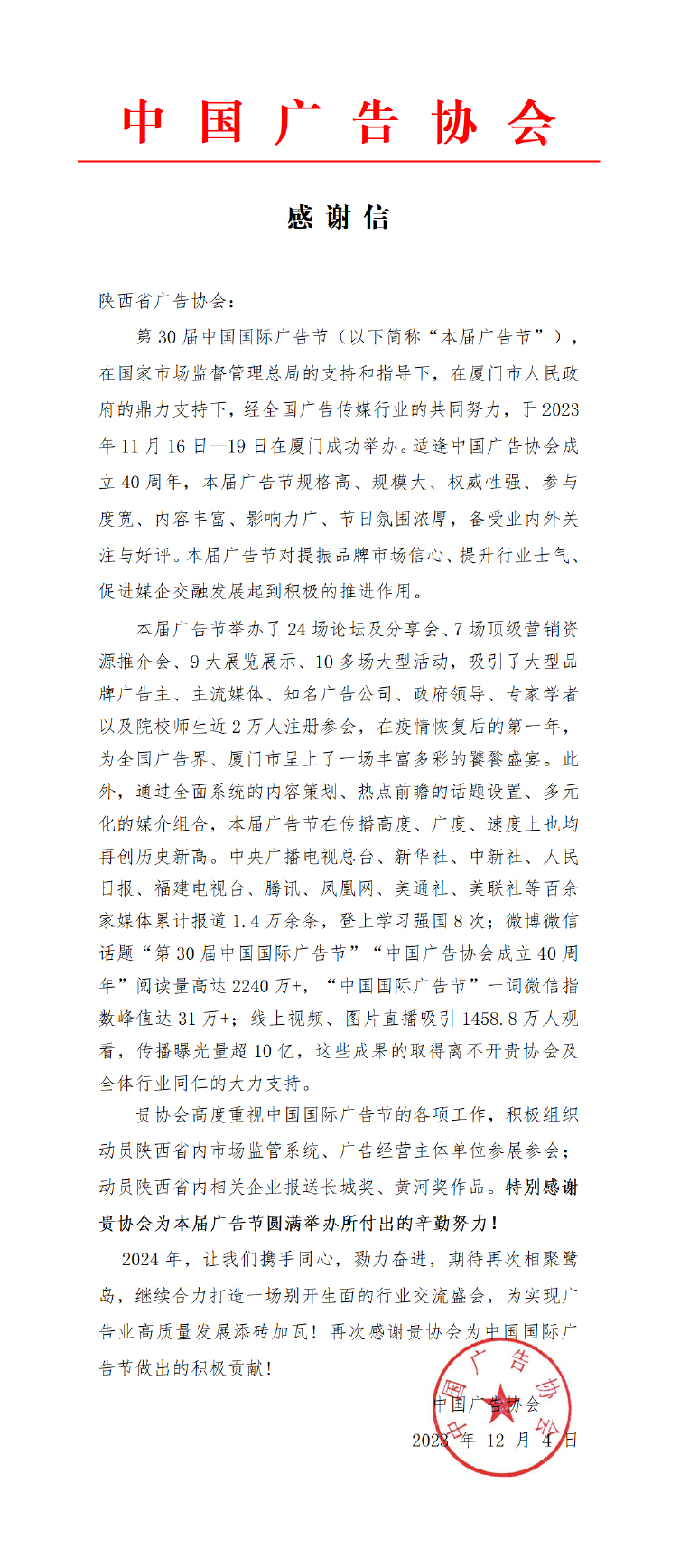 中国广告协会致信感谢陕西广告行业助力第30届中国国际广告节成功举办