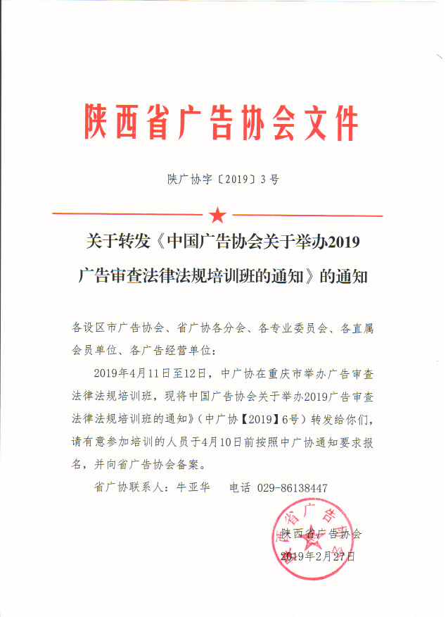 关于转发《中国广告协会关于举办2019广告审查法律法规培训班的通知》的通知