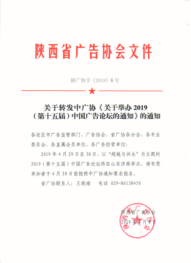 关于转发中广协《关于举办2019 (第十五届)中国广告论坛的通知》的通知