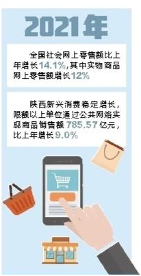 近年来,网络购物市场用户群体不断扩大,网上零售额及实物商品网上零售额快速增长。2021年,全国社会网上零售额比上年增长14.1%,其中实物商品网上零售额增长12%,增速明显高于线下消费。从陕西来看,2021年全省新兴消费稳定增长,限额以上单位通过公共网络实现商品销售额785.57亿元,比上年增长9.0%;占限上单位消费品零售额的15.8%,较上年提高0.7个百分点。