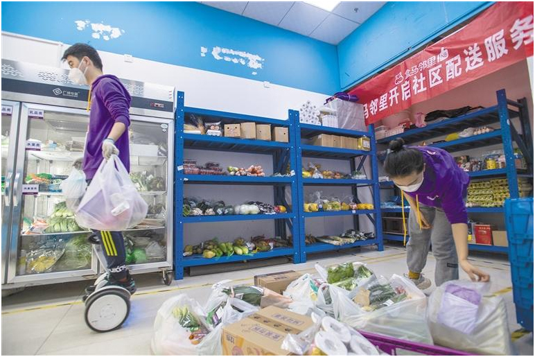 三月二十七日,地处西安曲江新区春临二路一小区楼下的盒马邻里店员,脚踏平衡车为住户送食材。盒马邻里除原有的到店自提方式外,还开启贴心的“送货到家”模式。目前,盒马邻里已在西安开设了二百七十家门店,覆盖小区居民超过五十万户。记者 袁景智摄