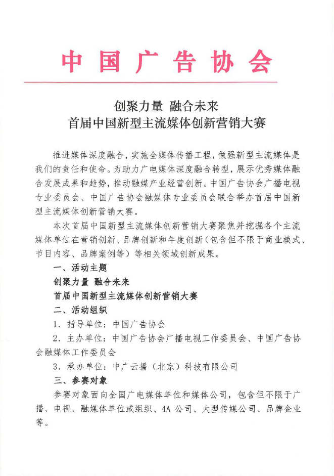 由中国广告协会指导,中国广告协会广播电视工作委员会、中国广告协会融媒体工作委员会联合举办的首届中国新型主流媒体创新营销大赛于2022年4月在北京正式启动。