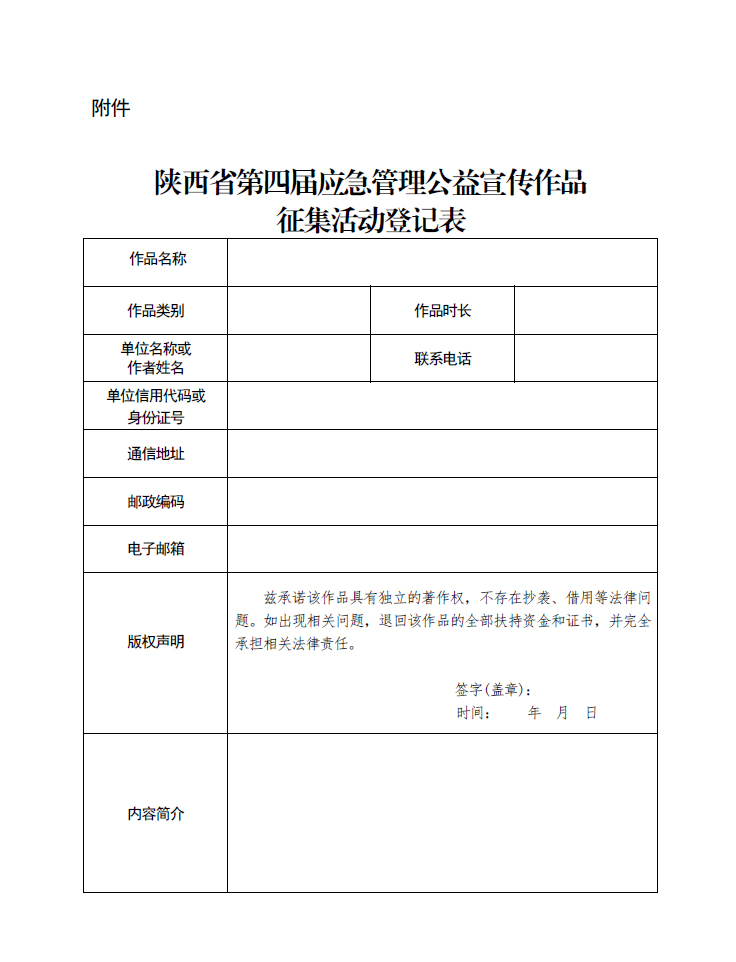 附件:陕西省第四届应急管理公益宣传作品征集活动登记表