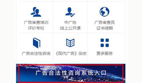用户可访问中国广告协会网站(http://www.china-caa.org),选择“广告合法性咨询系统入口”即可(或直接点击http://advert.china-caa.org/login)。