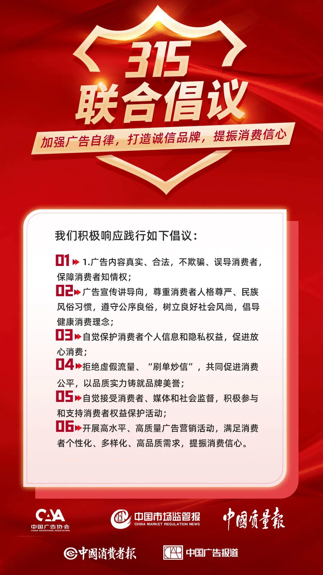 为贯彻党的二十大和中央经济工作会议精神,着力扩大内需,加强消费者权益保护,促进放心消费,提振消费信心,维护广告市场秩序,推进行业质量诚信自律,增强企业质量和品牌建设,营造良好社会环境,中国广告协会联合中国市场监管报、中国质量报、中国消费者报、中国广告报道等媒体共同发起#加强广告自律,打造诚信品牌,提振消费信心#3·15联合倡议活动。