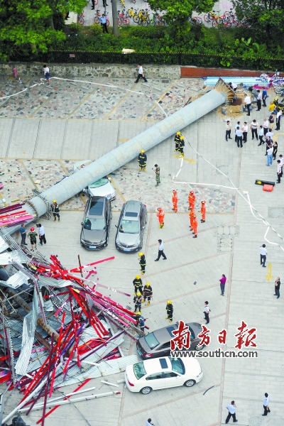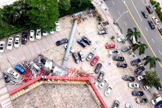 另据南方都市报报道:“一段视频将汇业写字楼停车场角落里的广告牌倒塌全程拍了下来。南都记者看到,该广告牌先是向停车场里倾斜,之后迅速倒塌。整个过程不到十秒。视频中可听到拍摄者以及围观者的尖叫声。”“倒塌的广告牌是钢管结构,有二三十米高,支撑柱直径1米左右,顶端是三面T型广告牌,每面约100平方米。”“倒塌广告牌底座有24个螺丝孔,倒塌后,底座地基完全断裂,水泥砖块散落在旁。固定底座的部分螺丝已弯曲,螺帽全被甩开,有的还生了锈。”