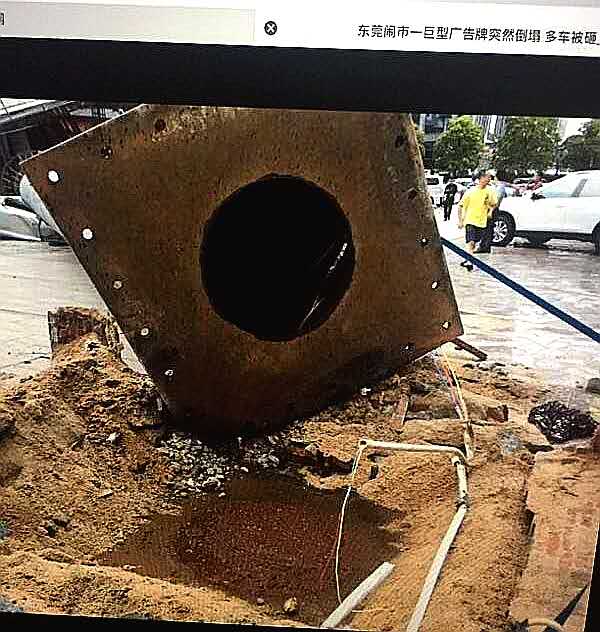 据9月1日南方日报报道:“8月31日15时30分许,东莞大道旁的汇业写字楼户外广场上的大型广告牌被大风刮倒。事件造成6辆小车不同程度损坏,未造成人员伤亡。目前,东城街道正配合市有关部门做好事件原因的调查工作。”