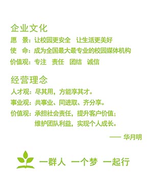 融合校园安全知识宣传与品牌文化传播于一体,以平安校园宣传栏为媒介,以“专注、责任、团结、诚信”的价值观,竭诚为在校师生构建最全面最有效的公益宣传平台、为企业打造最广泛最专业的校园媒体阵地。