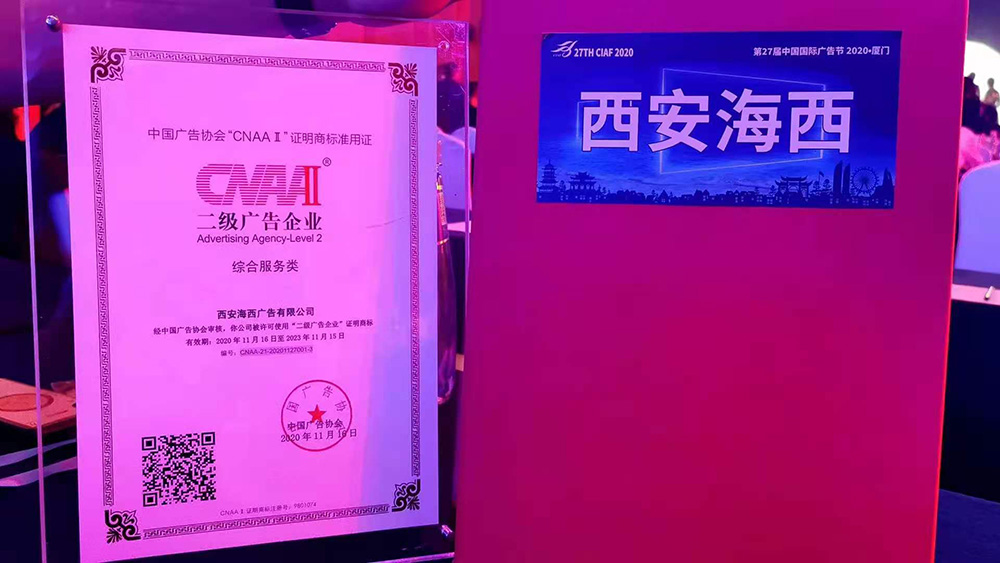 在11月16日晚2020年度中国广告协会证明商标授牌仪式上,西安海西广告有限公司获得中国广告协会“CNAAⅡ”(二级广告企业)证明商标使用资质。