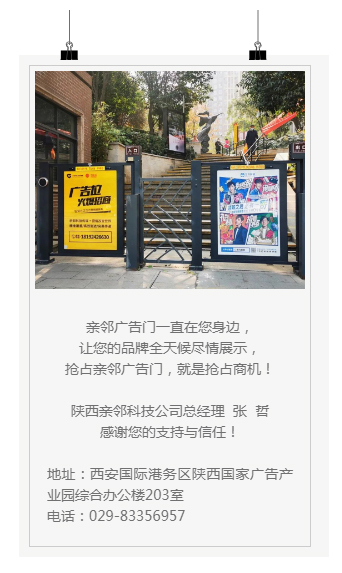 陕西亲邻科技社区门体LED高清灯箱的美观性、智能终端的互动性、媒体信息覆盖的精准性,以及较其它媒体的高性价比,让陕西亲邻科技赢得了众多广告投放客户的认可。