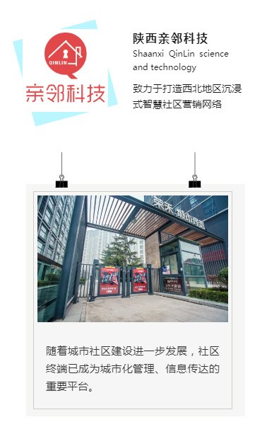 陕西亲邻科技致力于沉浸式智慧社区营销网络的构建,通过物联网解决方案,投入高品质智能门体及门禁设备,搭建社区生活服务平台,不断完善业主和物业对小区人行通道门禁设施安全性、便捷性的需求,拓展并打通社区线下、线上流量入口,形成产品、服务、用户和渠道环环相扣的社区营销生态,更好地服务社区和客户在广告、公益宣传等方面与消费者建立互动。