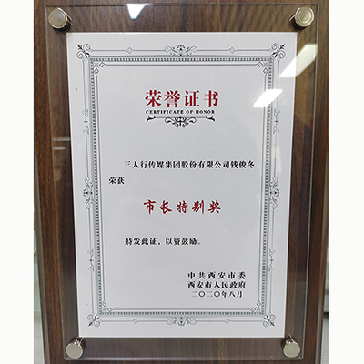 2020年8月,三人行传媒集团董事长钱俊冬荣获西安市“市长特别奖”。