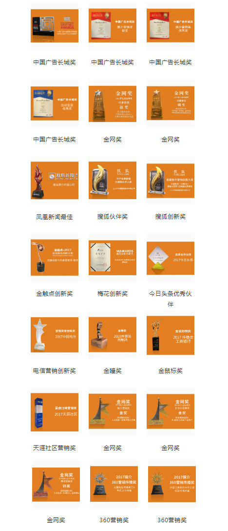 “中国广告长城奖媒介营销奖”、“全球商业创新大奖”、“金网奖”、“金鼠标奖”等行业大奖。