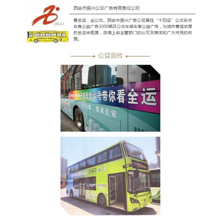 西安市振兴公交广告有限责任公司直属于西安市公共交通集团,自主经营西安市公交车体广告(自有媒体)。公司秉承“诚信经营,振兴公交,客户至上,携手双赢”的宗旨,先后为数千家国内外知名企事业单位提供卓越服务,同时致力于城市及公交的公益宣传,深受客户好评和行业瞩目,多次被评为全国、省市广告行业精神文明建设先进单位、守合同重信誉模范单位,获评媒体服务类中国一级广告企业、陕西一级广告企业。公司拥有全市360多条公交运行线路、8860余部大型公交车、2000多处公交车站牌、灯箱广告及语音广告等媒体资源。