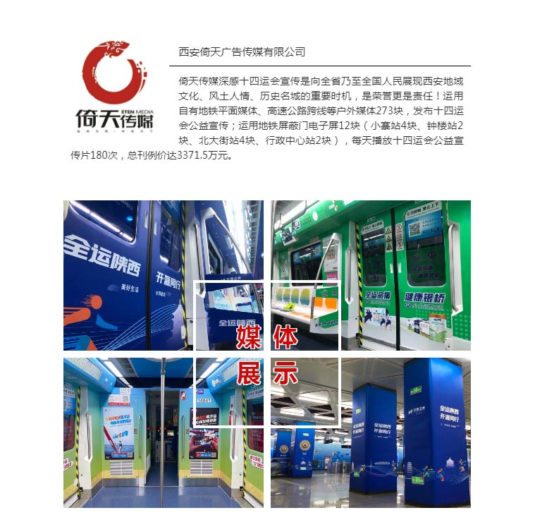 诚信为倚,传信天下!倚天传媒成立于2002年,综合服务类陕西一级广告企业,多年来扎根西安,始终坚持媒体传播与内容营销并重,在西安拥有城市地铁、高速户外媒体、机场媒体、公交媒体、地铁媒体、标识工程等多个板块自有媒体,为多地政府和国际、国内知名品牌客户及上市公司,提供一站式综合性的媒体解决方案,开展跨区域媒体投放,成功树立“一站式户外媒体解决方案服务商”的清晰定位。公司媒体板块形成覆盖陕西各市县、深耕西北各城市的自有媒体平台和整合投放平台,是一家实力雄厚的创新型综合性广告传媒企业。