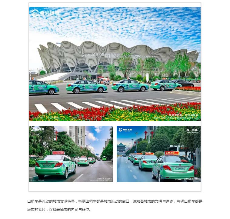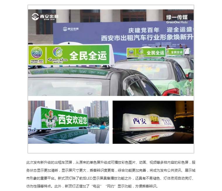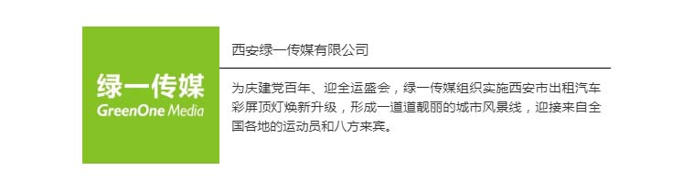 绿一传媒,向上的力量!历经多年发展积累、开拓创新,绿一传媒已成为陕西省规模大、实力强、覆盖广、业务全、影响力巨大的知名广告媒体运营商。公司运营西安市15000余辆出租车弹屏媒体广告业务,以全天候、全市域覆盖、高频次曝光、文字简洁易懂易记等媒体优势得到了广大客户的一致好评,相继被评为中国区域性视频媒体10强,陕西最具影响力户外媒体。绿一传媒不断创新探索,打造“城市核心区域LED+城市流动TAXI 顶屏+蓝绿策划”全案营销服务平台。出租汽车顶屏的焕新升级,带给绿一传媒焕新出发,创变未来的决心,绿一传媒将牢记民营企业的社会责任,不断向前,打造中国最具影响力的传媒企业,助推民族品牌的成长。
