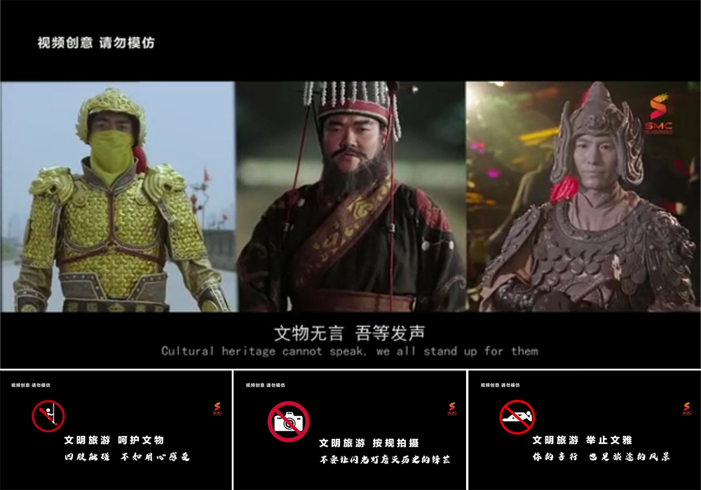 《文物无言 吾等发声》围绕西安的城市古装IP:“金甲武士”、“石头哥”、“秦始皇”进行多元素创作,分别穿越到西安标志性景区:城墙、大唐不夜城和秦始皇帝陵博物院,趣味劝导游客不文明行为,为文物景区发声,旨在提升游客文明旅游自觉,创造良好旅游氛围。