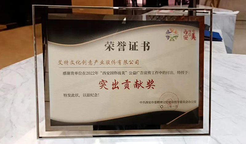 2023年1月17日,由中共西安市委文明办主办的“西安因你而美”2022年度公益广告征集展示活动颁奖典礼在浐灞生态区城建博物馆成功召开,艾特荣获西安市委文明办授予的“ 西安因你而美”公益广告宣传突出贡献奖。