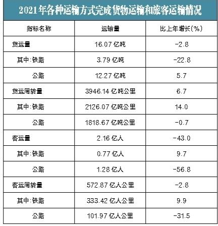 全年货物运输总量16.07亿吨,比上年下降2.8%;货物运输周转量3946.14亿吨公里,增长6.7%。旅客运输总量2.16亿人,下降43%;旅客运输周转量572.87亿人公里,下降2.8%。