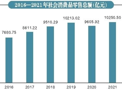 全年社会消费品零售总额10250.50亿元,比上年增长6.7%。按经营地分,城镇消费品零售额8997.77亿元,增长5.3%;乡村消费品零售额1252.72亿元,增长17.9%。按消费形态分,商品零售额9101.73亿元,增长5.5%;餐饮收入1148.76亿元,增长17.4%。