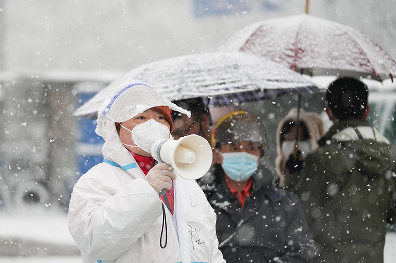 3月18日,在北京市东城区北新桥街道一处核酸采样点,工作人员冒雪引导前来检测的居民。新华社记者 鞠焕宗 摄