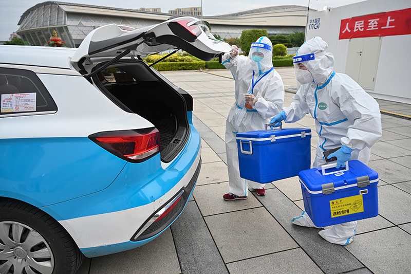 3月24日,在福建泉州市海峡体育中心联合方舱核酸检测基地,参加“抗疫志愿车队”的出租车司机(左)协助医务人员装运核酸检测样本。新华社发(周义 摄)