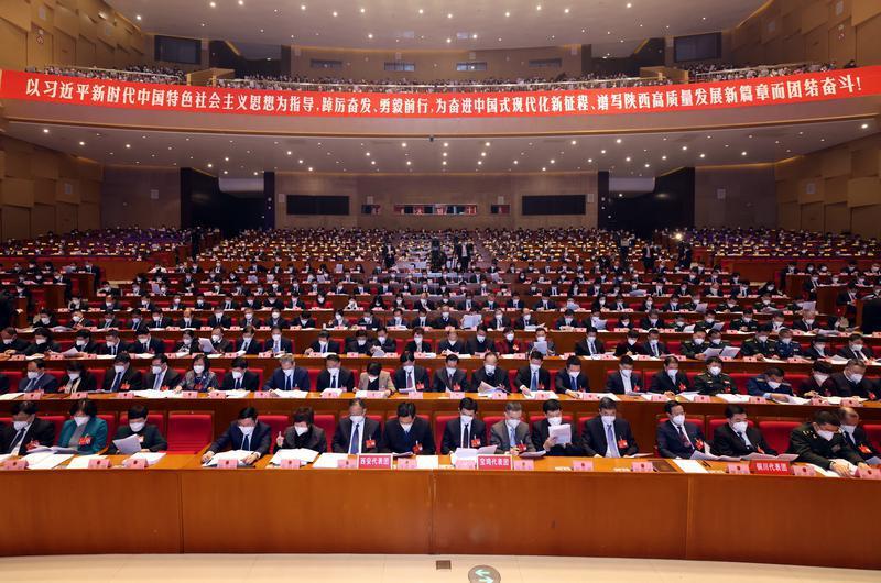 会场庄严简朴,气氛隆重热烈。大会主席台帷幕正中的国徽在鲜艳的红旗映衬下熠熠生辉。主席台对面的眺台上高悬“以习近平新时代中国特色社会主义思想为指导,踔厉奋发、勇毅前行,为奋进中国式现代化新征程、谱写陕西高质量发展新篇章而团结奋斗!”的横幅,鼓舞人心、催人奋进。