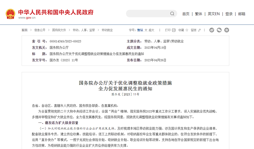 为全面贯彻党的二十大和中央经济工作会议、全国“两会”精神,落实国务院2023年重点工作分工要求,深入实施就业优先战略,多措并举稳定和扩大就业岗位,全力促发展惠民生,经国务院同意,现就优化调整稳就业政策措施有关事项通知如下: